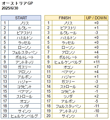 1.マクラーレン2台が素晴らしいスタート。1コーナーでピアストリが2位ルクレールの前に出る。ターン3ヘアピンでアントネッリがインから強引に仕掛けたように見え、フェルスタッペンの右リアと接触してスピン、2台ともストップ。セーフティカー導入。アントネッリとしてはリアがロックしてアンコントローラブルだったようだ。