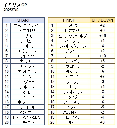 52. ノリスが悲願の母国GP初優勝。何度もF1を観戦し、初めて走ったコースもここシルバーストーンであった。 ヒュルケンベルグはキャリア14年目、239戦目、37歳にして初の表彰台獲得。ドライバーオブザデイもヒュルケンベルグ。(コラピントがピットスタートであったため)2戦連続最後尾スタートからポイントを獲得してもいる。4位ハミルトンも母国レースで、3位ヒュルケンベルグとの差を5秒まで縮めていた。