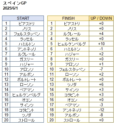 66.ターン1のラッセルとフェルスタッペンのオフコース走行順位についてはお咎め無しであったため、実は順位をラッセルに明け渡す必要が無かった? ただ、ラッセルがフェルスタッペンの前4位の状況下で下された裁定のため、状況が異なればマーシャルの判断は違っていたかもしれない。 ピアストリがポール・トゥ・ウィン。今シーズン5勝目。最後の波乱にも巻き込まれなかった。 フェルスタッペンは中古ではハードも持っていたため、それでも新品ハードを穿かせたのはなぜだったのか。 順位を戻した際のラッセルとの衝突でフェルスタッペンに10秒ペナルティ。これでヒュルケンベルグ5位、アロンソ9位となる。